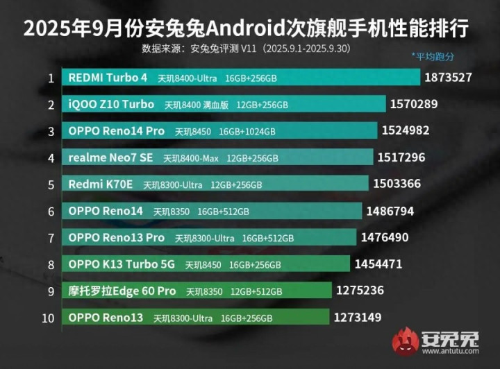 2025年9月份安兔兔Android次旗舰手机性能排行, 天玑芯片霸榜